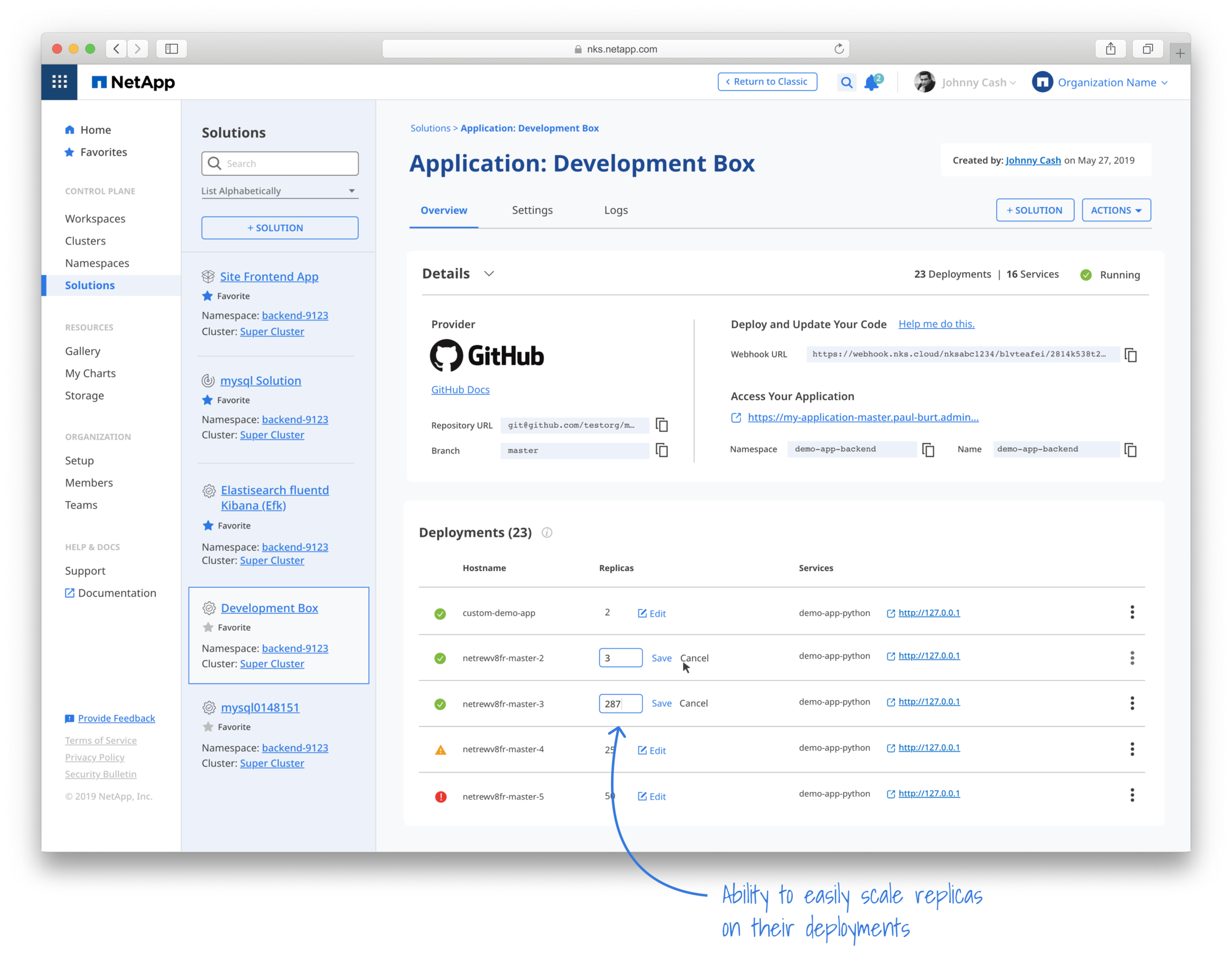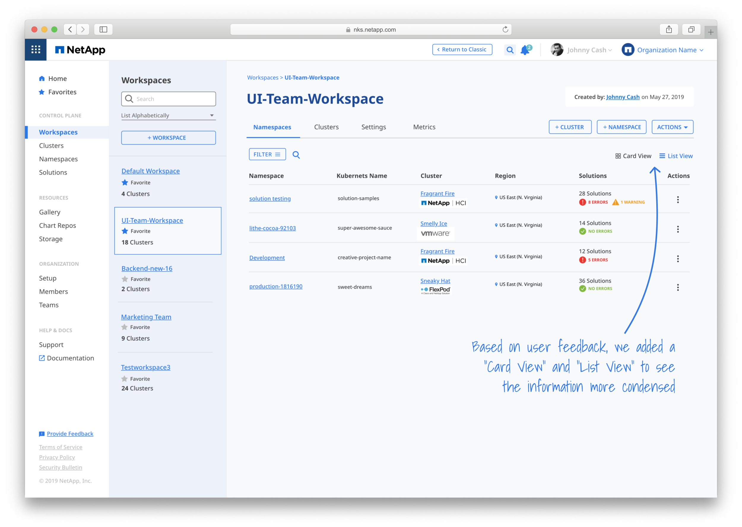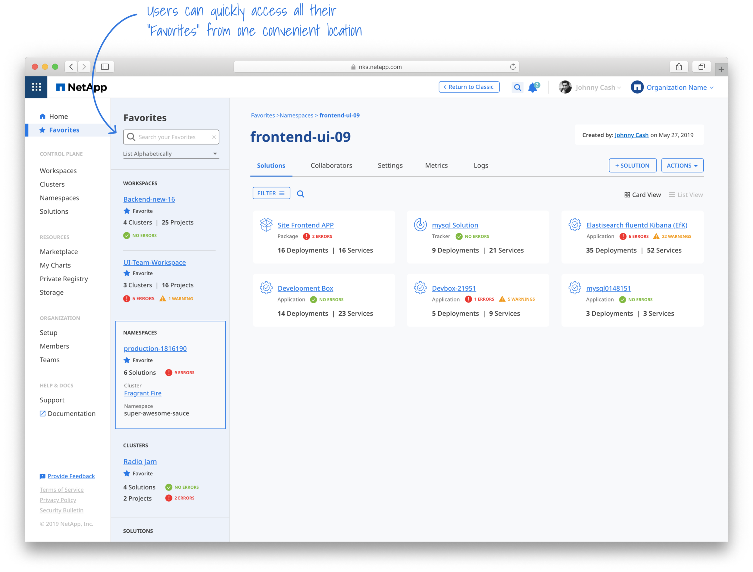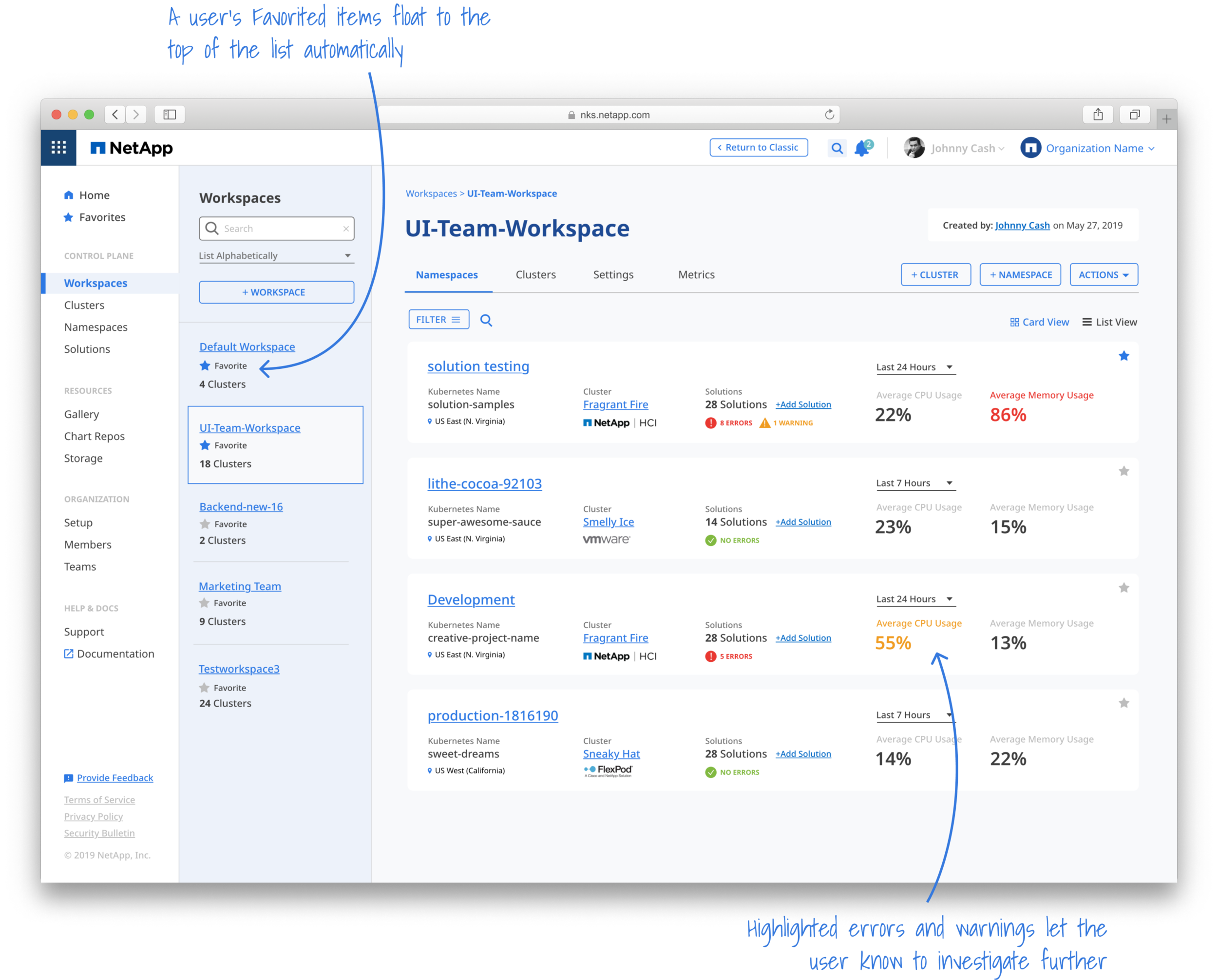 ““I really like the new structure of NKS with Workspaces, Clusters, Namespaces, and the organization of having the navigation pane on the left. Having the most important things show first and the concept of Favorites so that I can build my best view is great.””