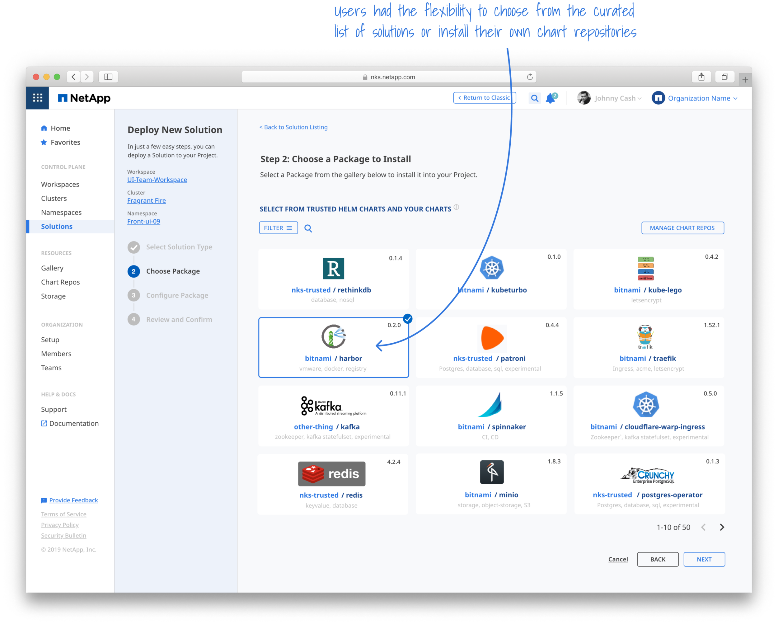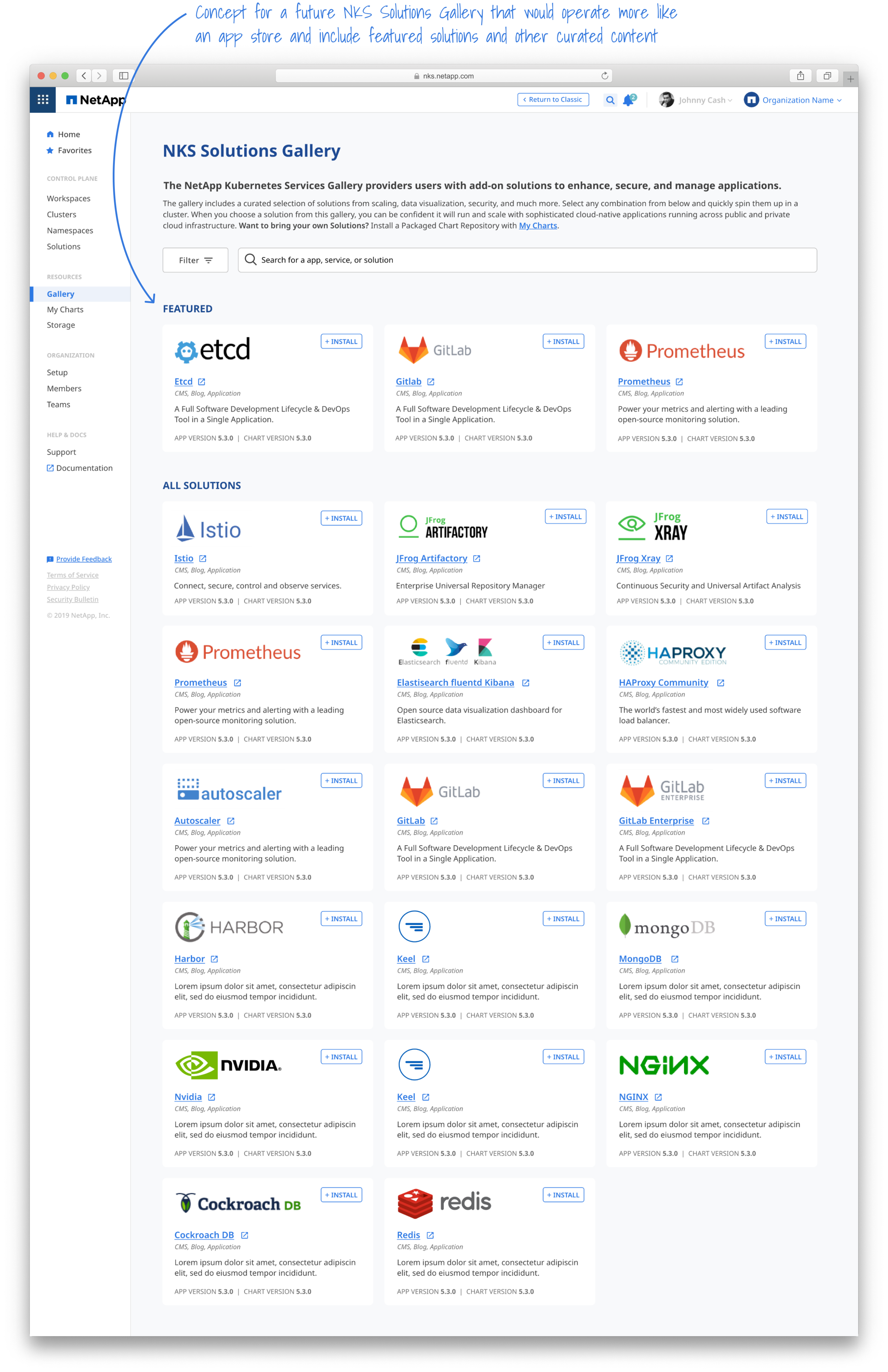 NKS provided a curated selection of solutions from scaling, data visualization, security, and much more. Users could select any combination and quickly spin them up in a cluster. Users could be confident the solution they chose from the NKS gallery would run and scale with sophisticated cloud-native applications running across public and private cloud infrastructure. Users could also choose to install their own chart repositories into NKS.
