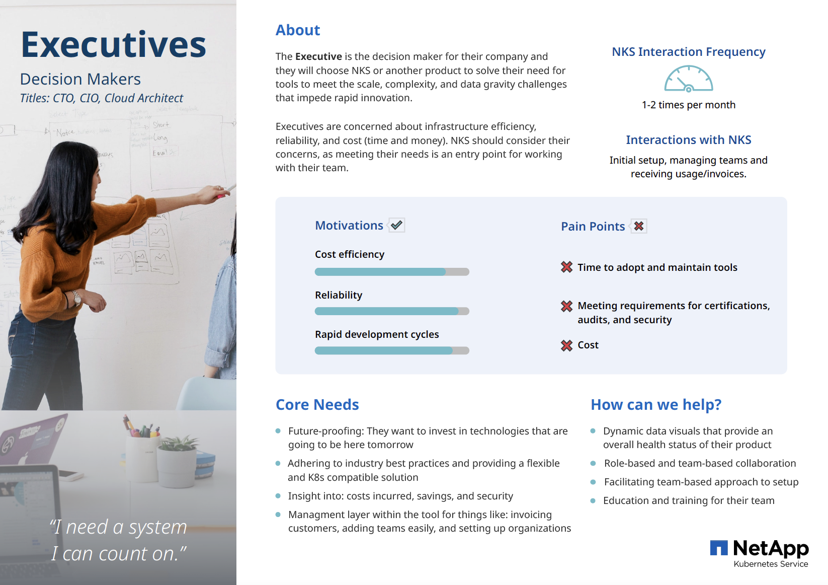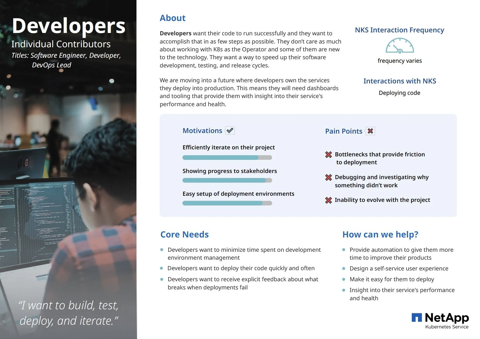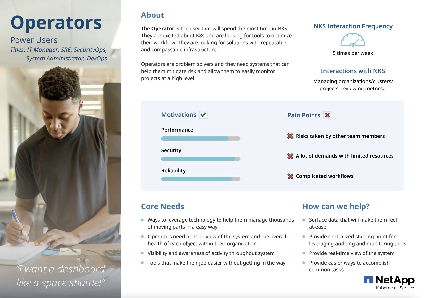 To better understand who we were building NKS for and why they needed a solution like this, we wanted to identify user archetypes, the common problems they were facing, and how NKS could successfully help.
