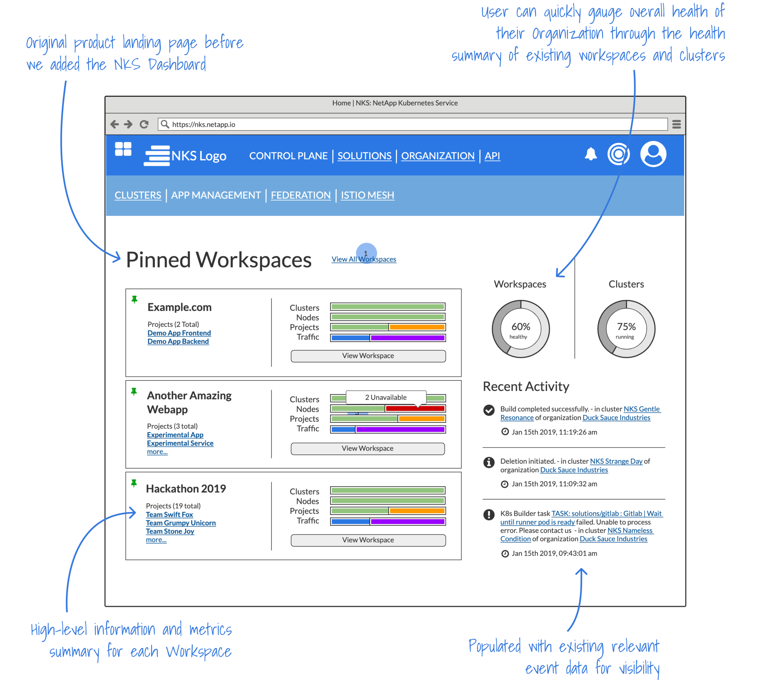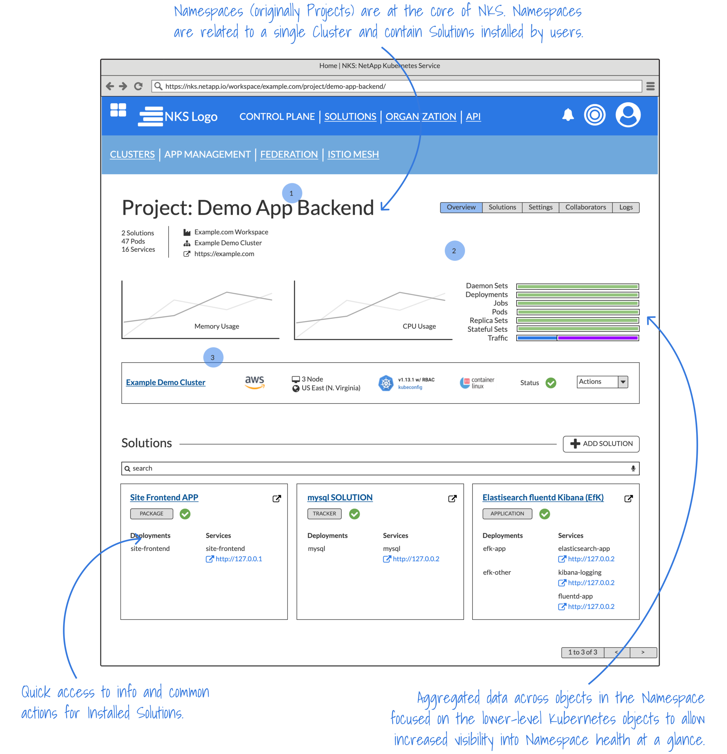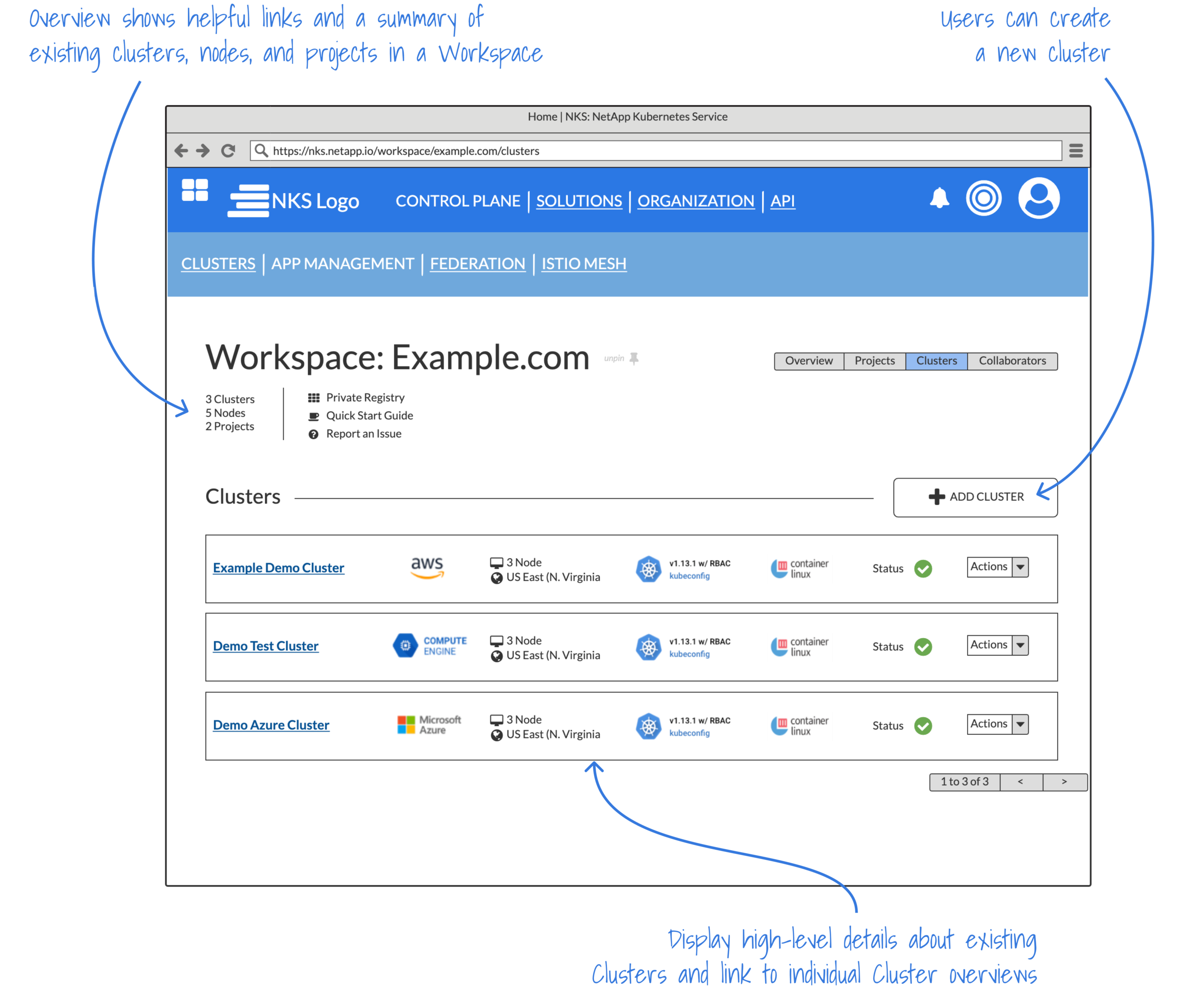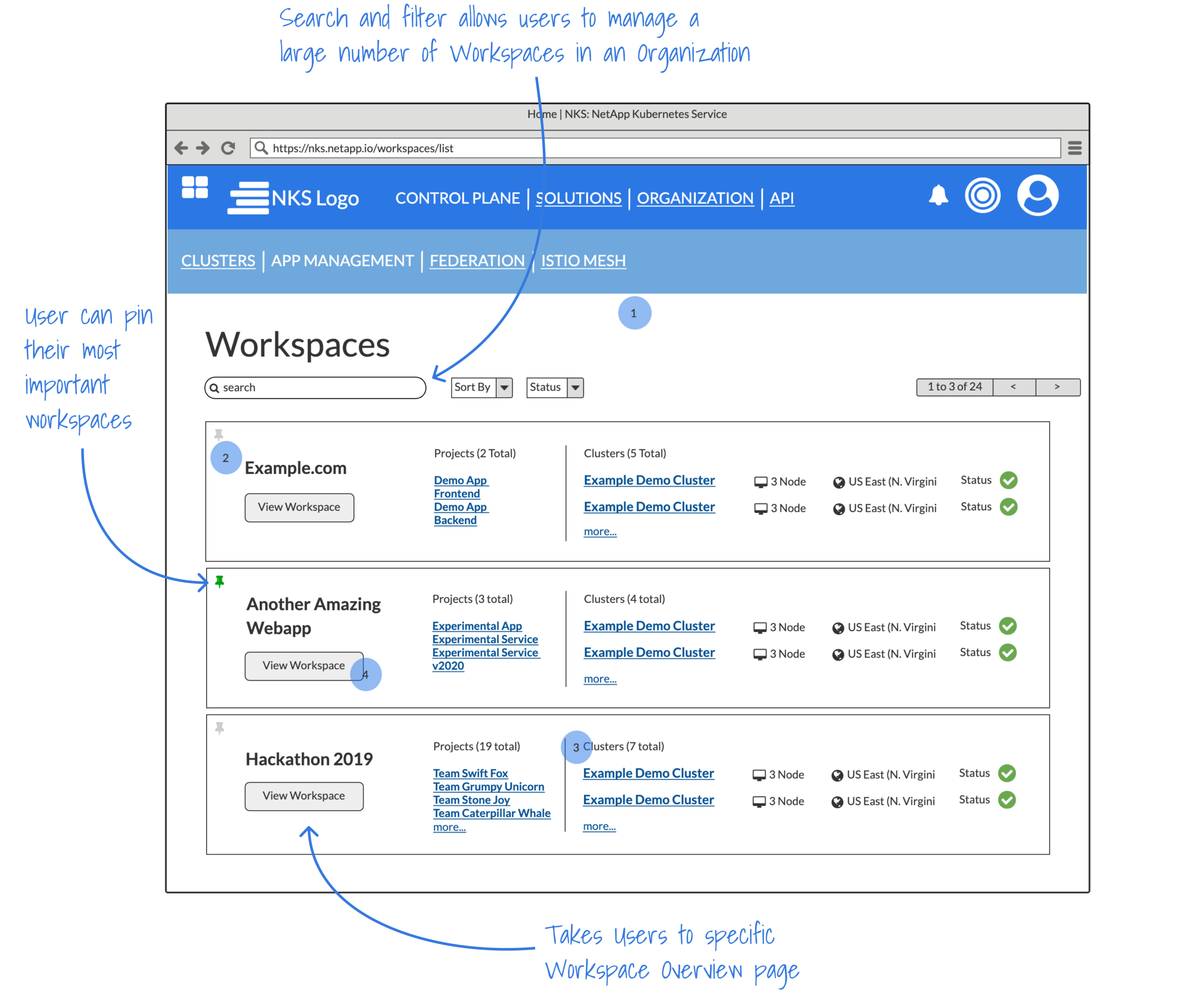 Initially, when a user navigated to their Workspaces, Clusters, Namespaces or Solutions from the navigation, they would land on a page with a table of existing Workspaces, etc. and then click into each one to see more details in an interior page.