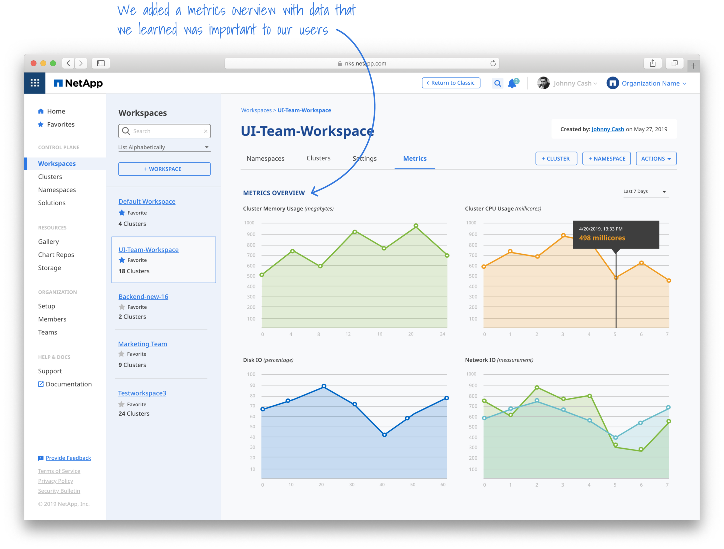 Although it was disappointing that we didn’t get to see all the work we put into NKS come to fruition in NetApp’s product line, our design and development team was moved to a new team, Spot by NetApp. Spot’s suite of products uses machine learning to automate scaling in a user’s cloud infrastructure to ensure performance, reduce complexity and optimize costs. We were able to bring our knowledge and experience, along with the research and design insights we learned from NKS, to raise the bar for Spot’s design and engineering.
