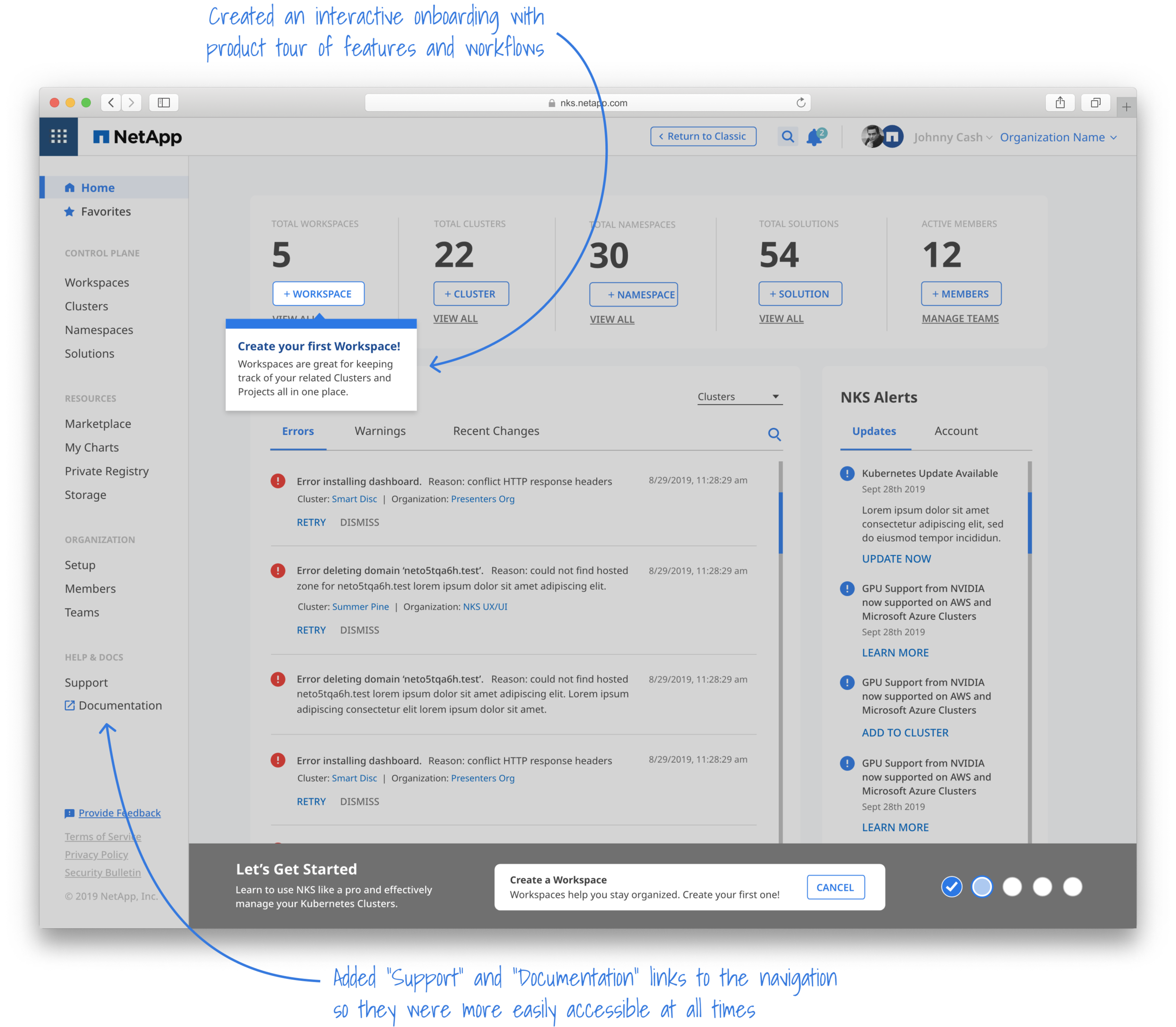 In alignment with our goal of creating a simple and easy to use application, NKS’s Support, Documentation, and Onboarding features provided users with the information they needed to keep their applications running and enabled a quick troubleshooting process for any issues that did arise.