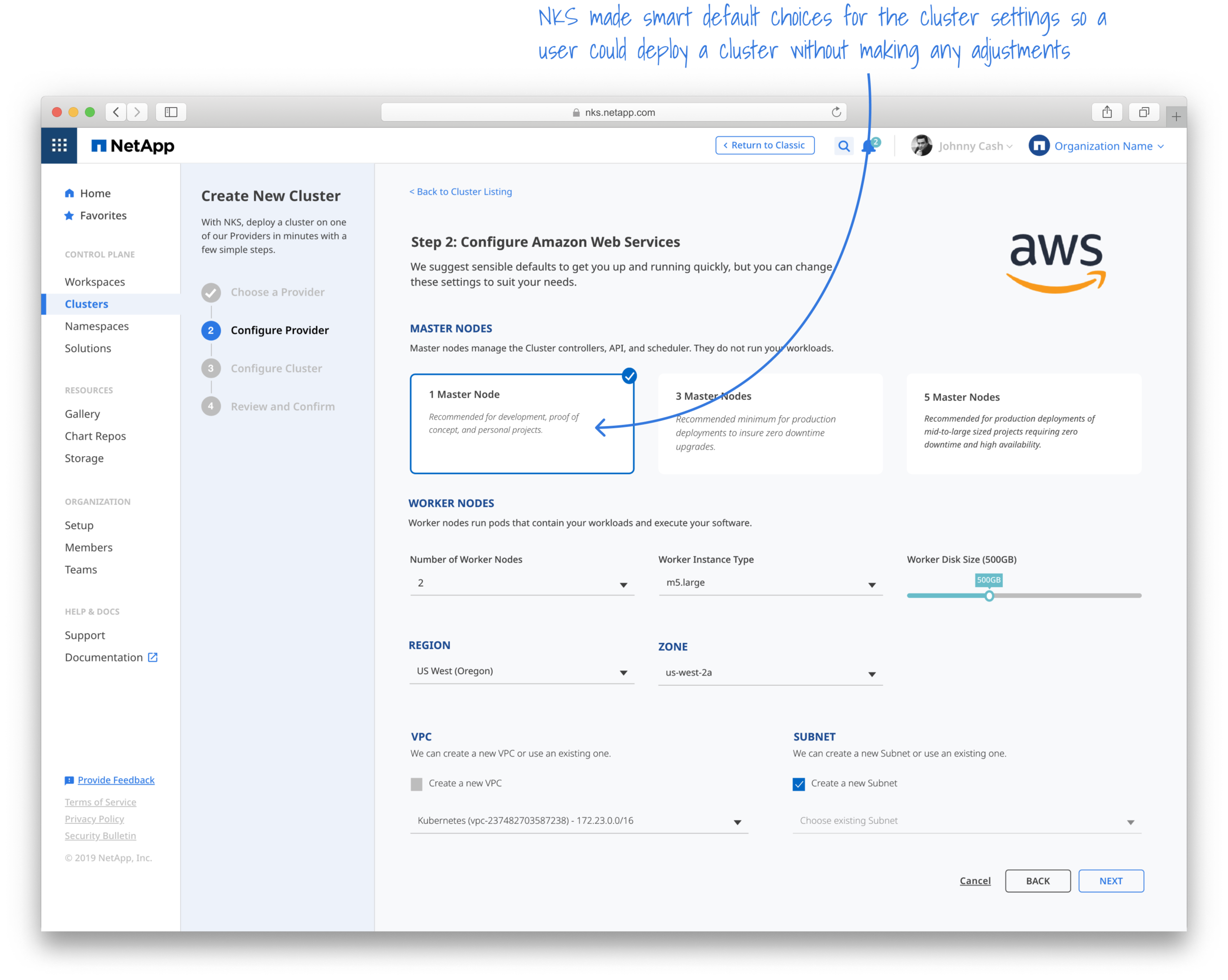 Well-managed Kubernetes Clusters formed the foundation of the tools within NKS. Although Clusters can be run on any supported cloud services provider. NKS allowed Clusters from different providers to be grouped together into the same Workspace. Building Kubernetes infrastructure is notoriously complex, and the NKS process gave the users as little or as much control as they needed. Users were able to create container clusters with just a few short steps or modify advanced settings to meet their needs.