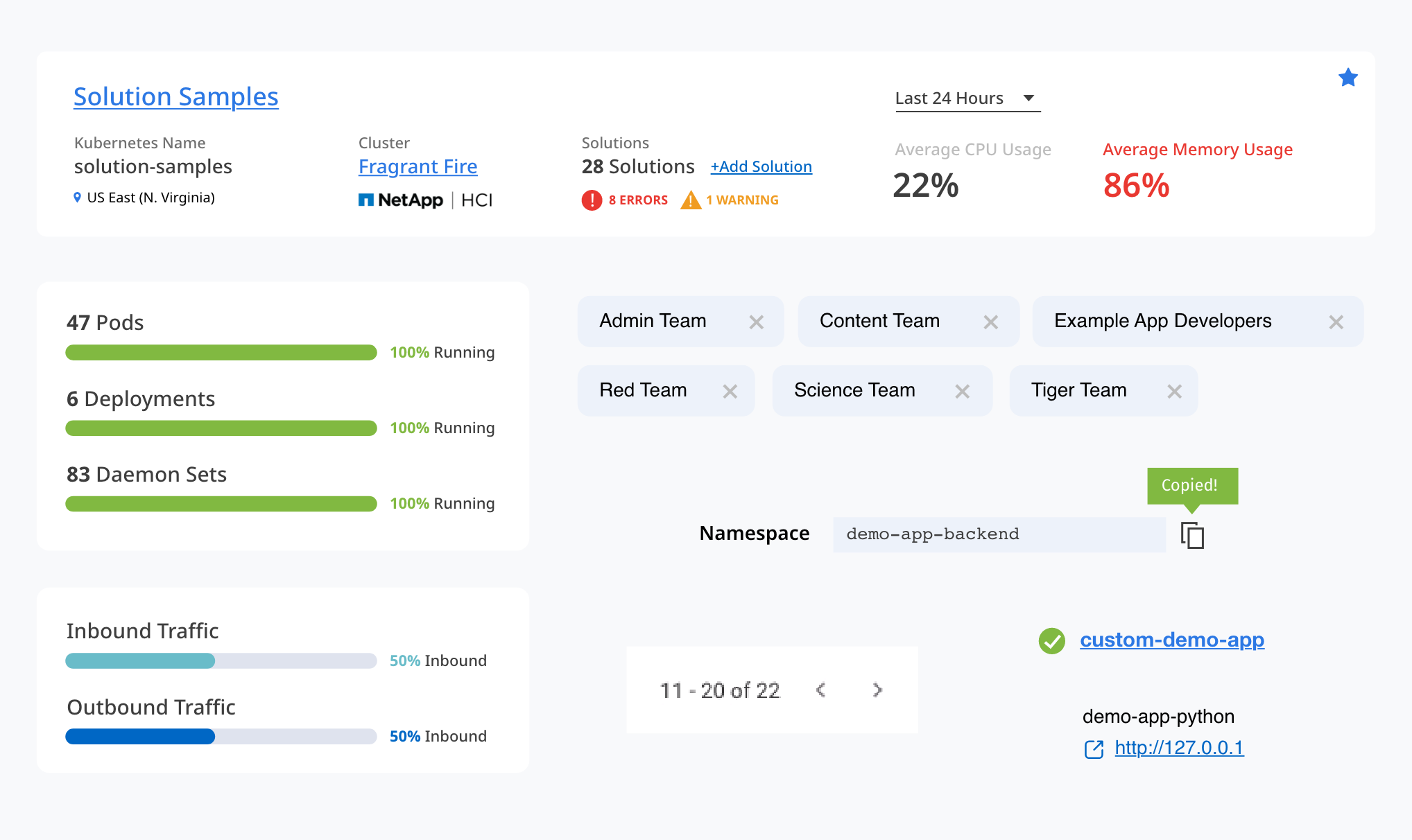 Workspaces provided the grouping mechanism used in managing all resources in the user’s NKS Organization, especially access to Clusters, Namespaces, and Solutions. NKS gave Organization administrators control by allowing them to group Members into Teams and assign Teams to Workspaces. Team assignments were reflected in the RBAC and in other access settings for all NKS resources. In the right content area, users could quickly flip through the Namespaces, Clusters, Settings, and Metrics in the selected Workspace and add any new clusters or namespaces as well.