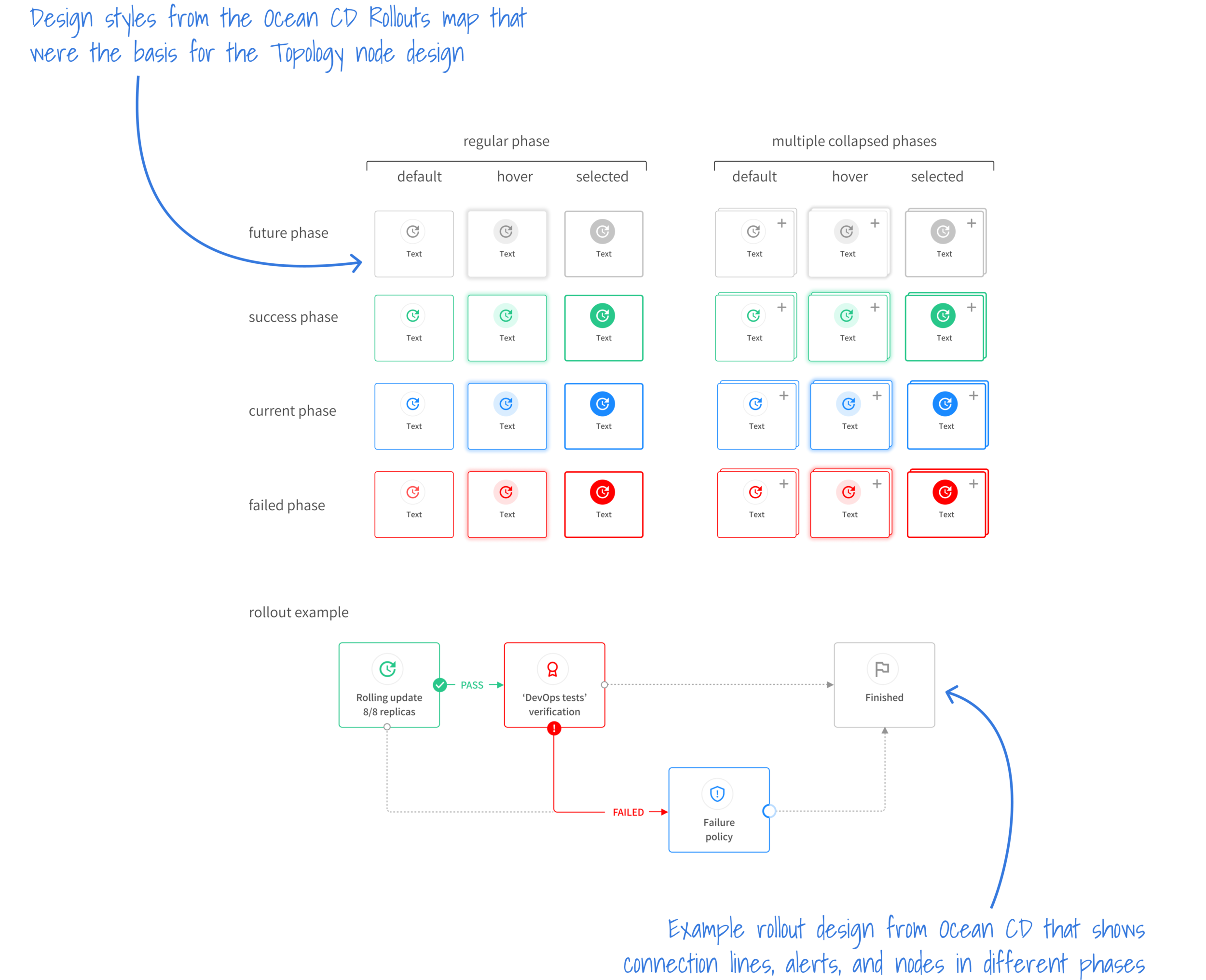 As we were ideating on designs for the Topology map, I met with other designers in the Spot by NetApp design guild to see if there were any existing components in their products that could be useful. Luckily for us, the lead designer for Ocean for CD was also building a map feature to visually display Rollouts.