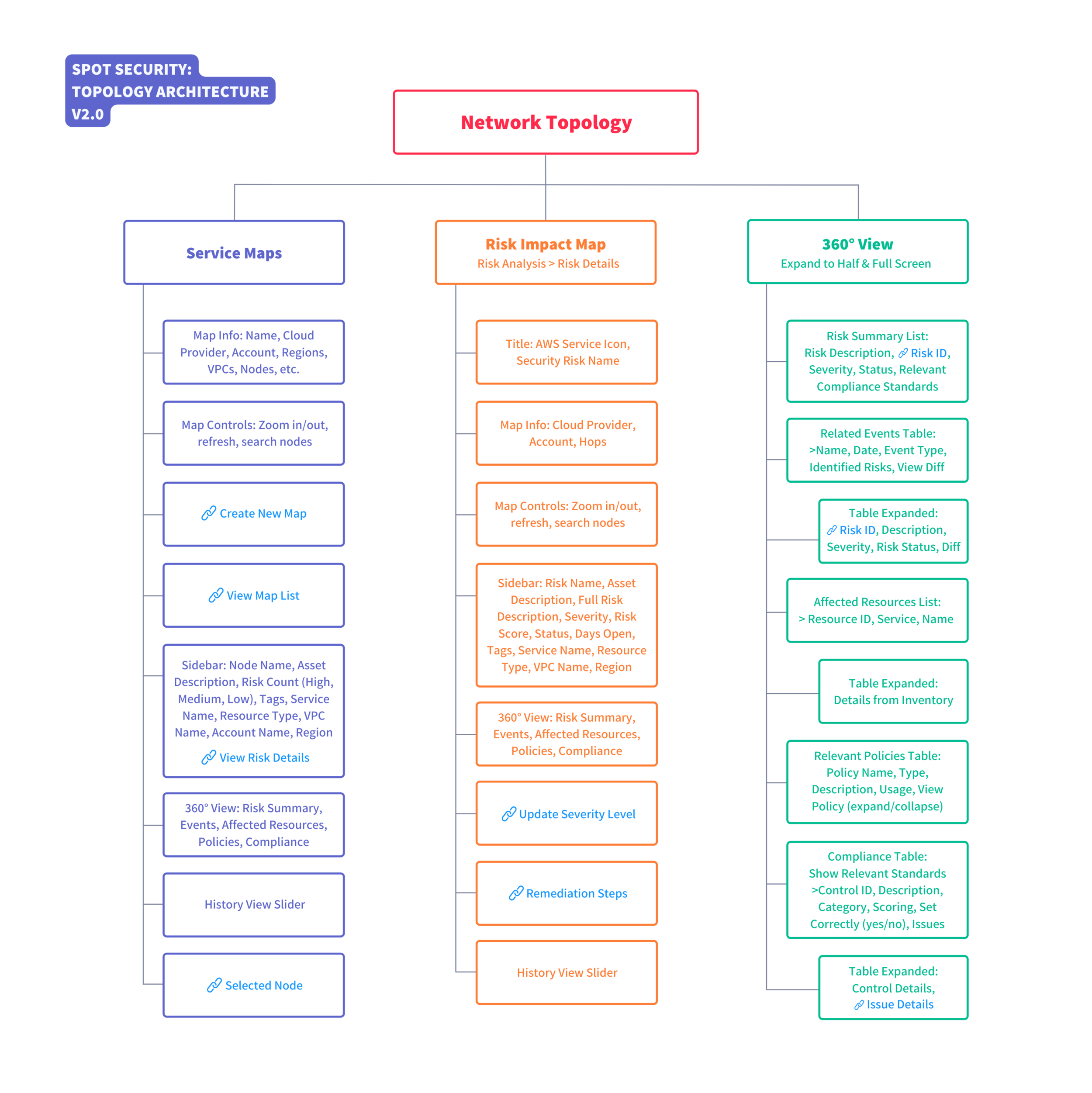Topology maps are the visual structure of relationships and links among elements and nodes within a network. These maps are powerful tools in providing complete visibility into a cloud environment and allowing the user to investigate security vulnerabilities. Spot Security needed a dynamic topology map feature to cut through the noise, identify the highest impact risks, and allow users to quickly remediate them.