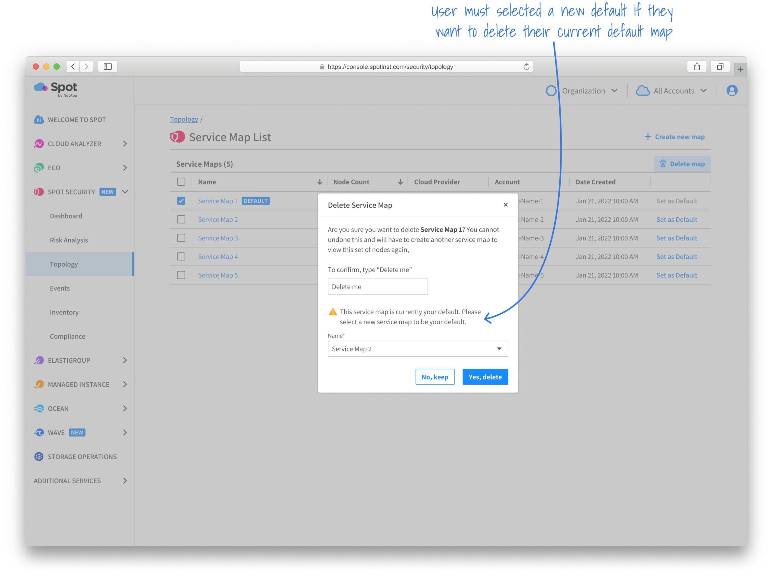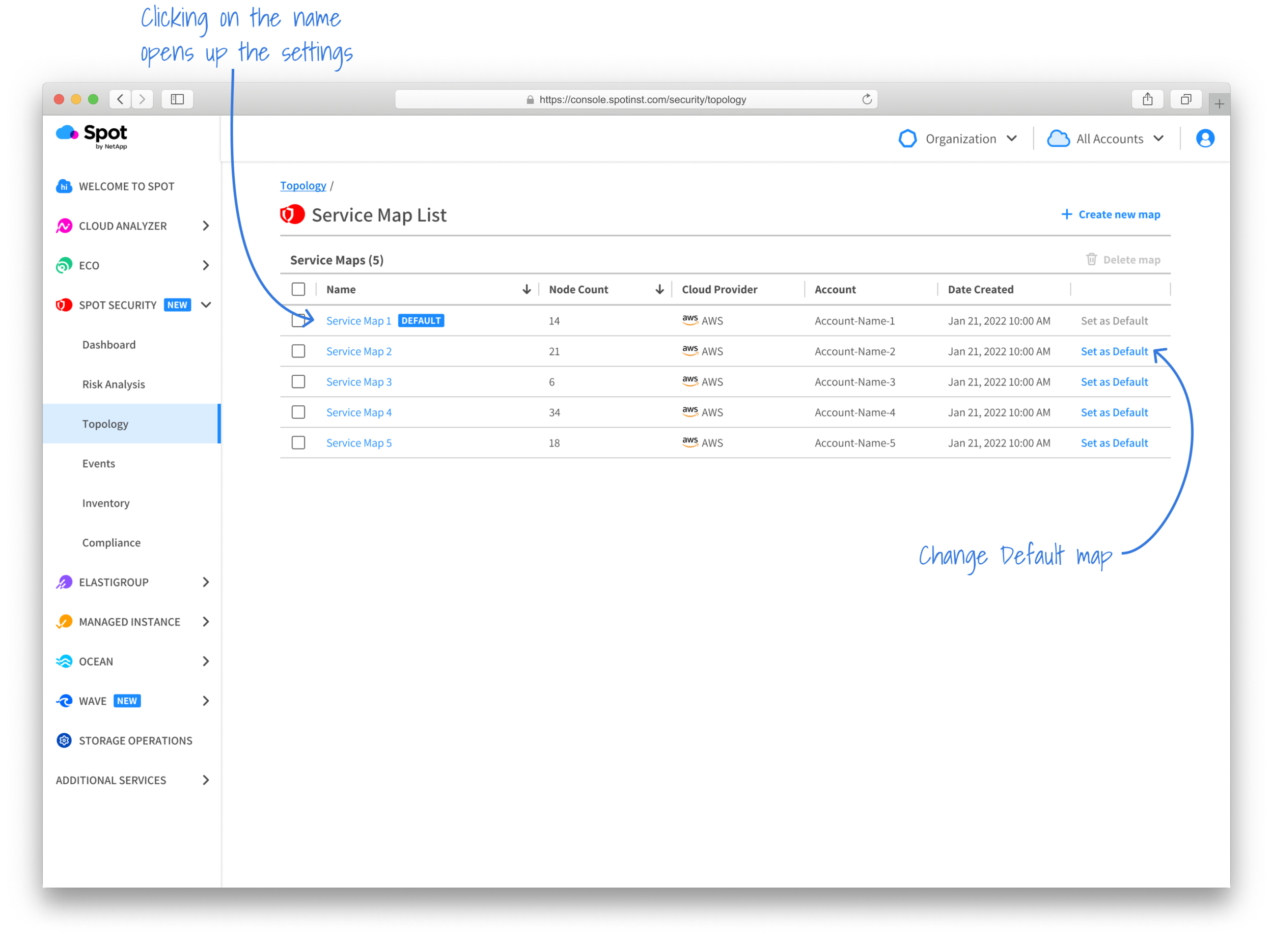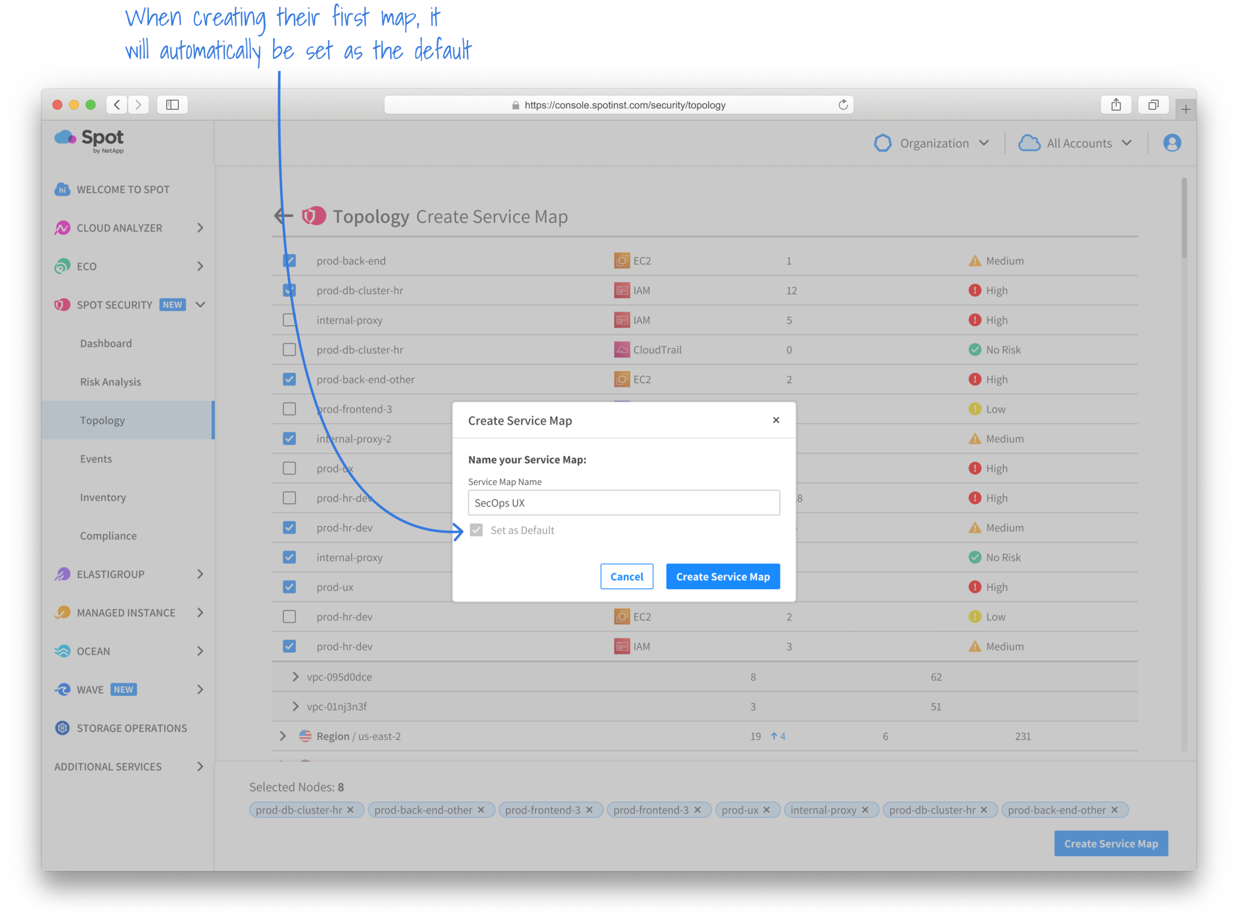 We wanted to avoid having users drop into an unfiltered view of their entire cloud environments and have to wait for thousands of nodes to load before they could use the tool. To bypass this issue, we developed the concept of a Service Map, which allows a user to choose specific nodes in their environment, group them together, and save them as a view. Users can create as many Service Maps as they need for their workflow.