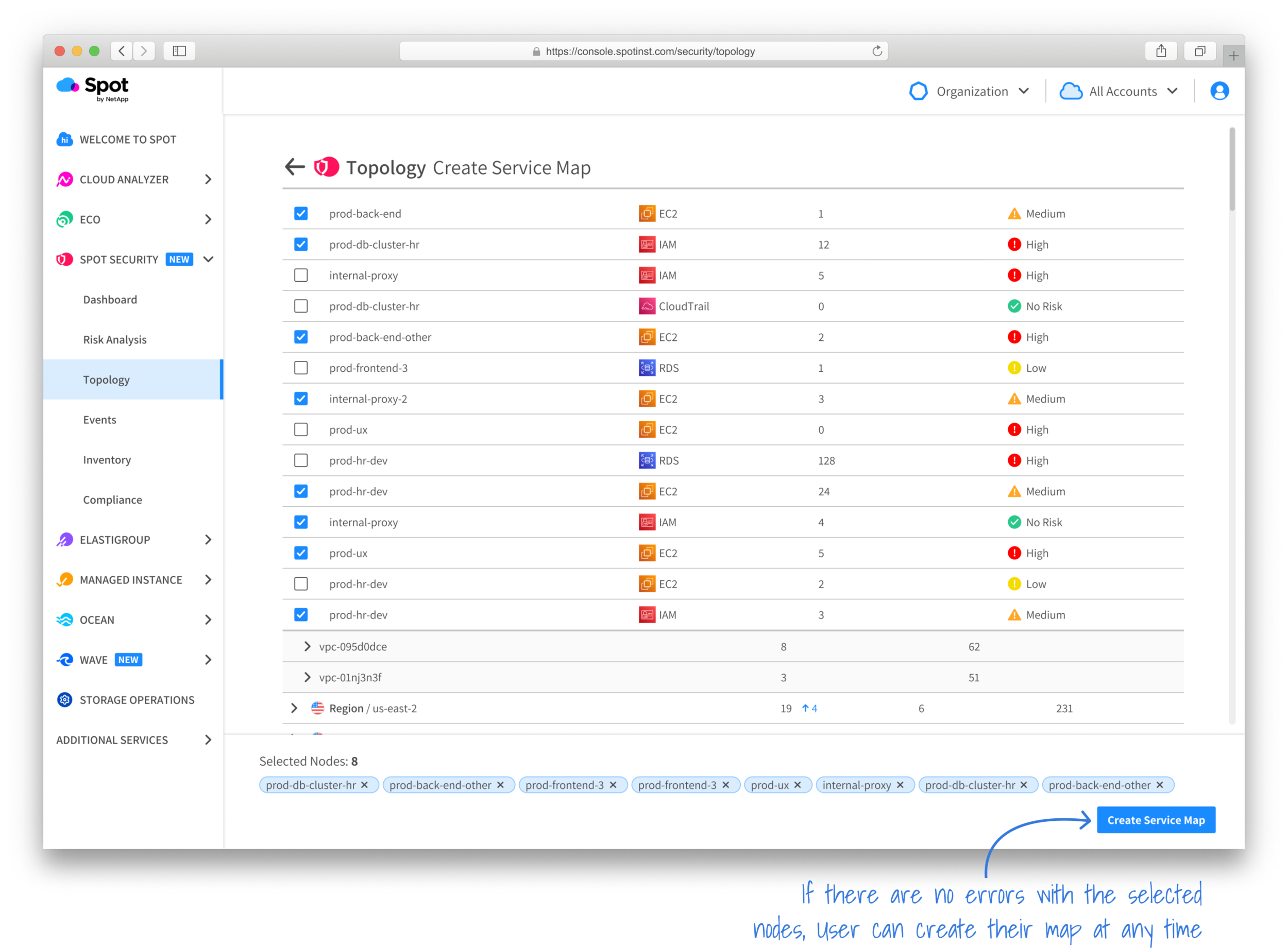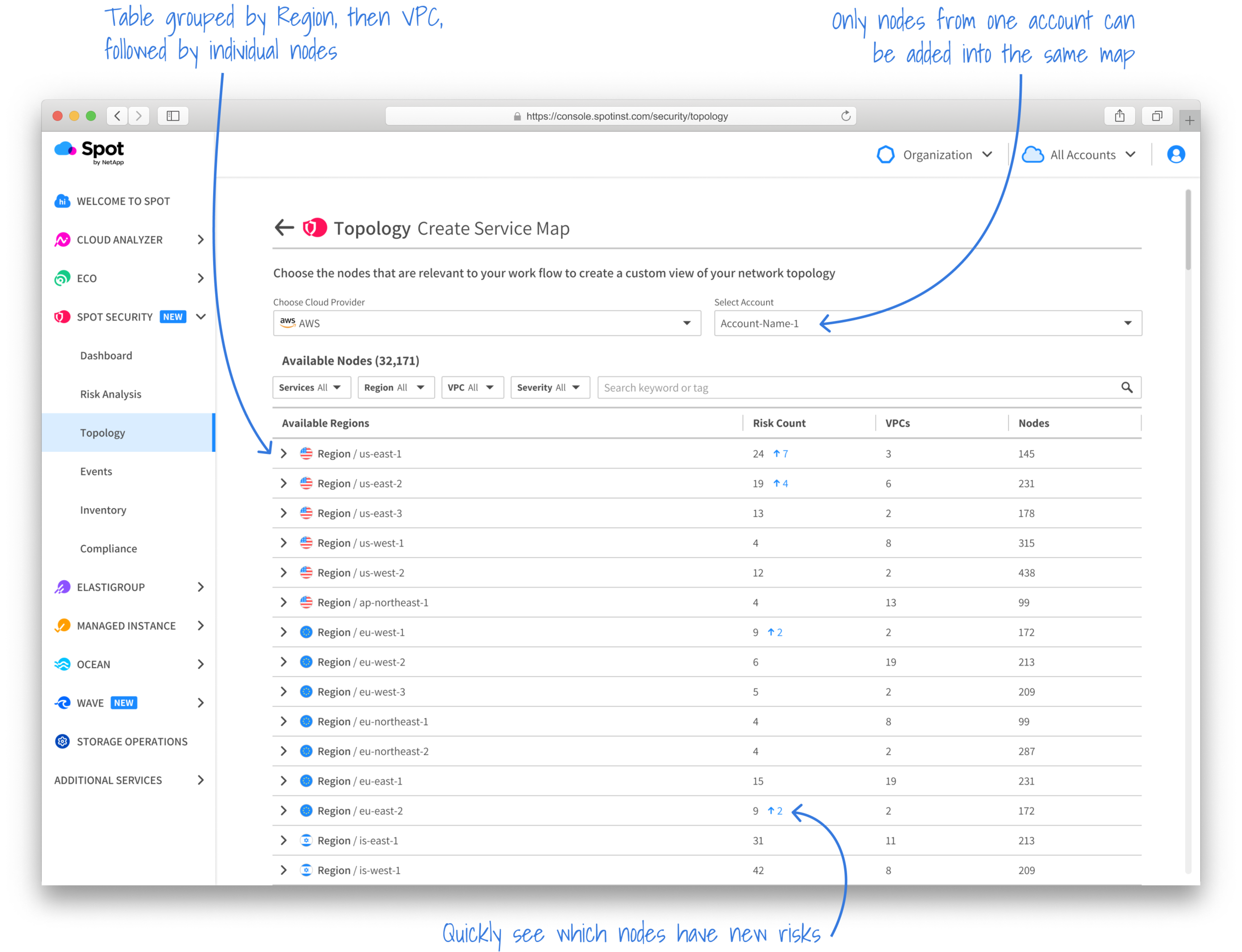 In late 2020, Spot by NetApp acquired CloudHawk.io, an agentless cloud infrastructure monitoring application that became the base of the Spot Security product. CloudHawk featured a topology map of the user’s cloud deployment overlaid with security monitoring findings, which was a great starting point for the updated Topology in Spot Security.