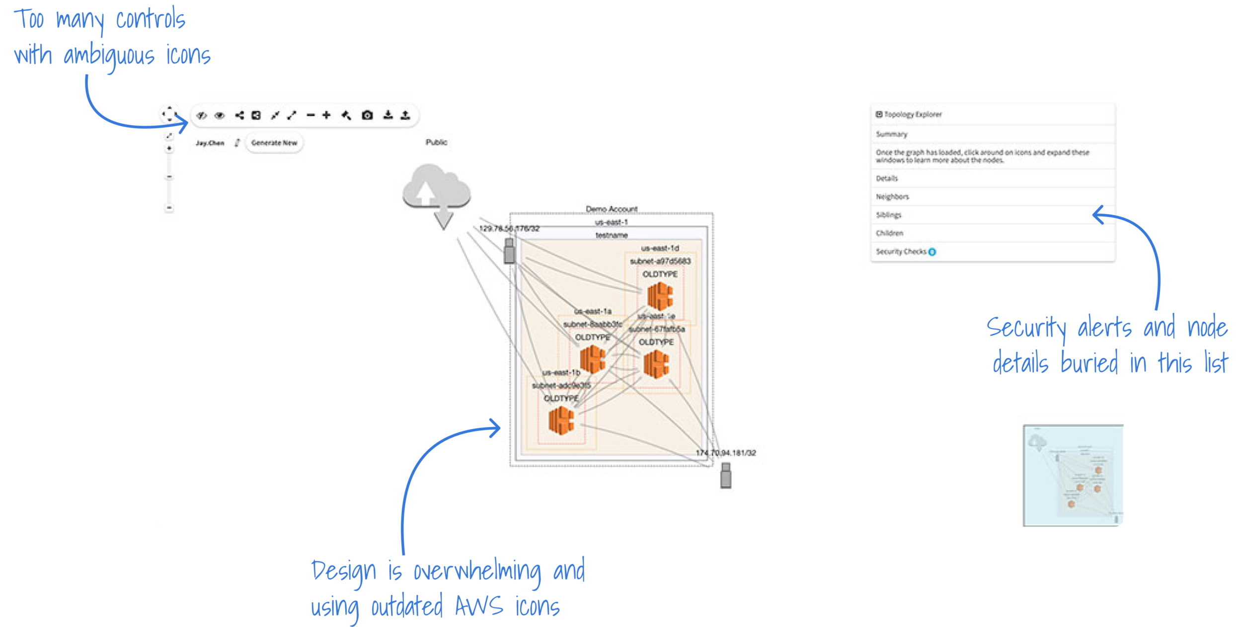 Through interviews with existing CloudHawk customers and general SecOps users, reviewing analytics data, and compiling an extensive competitive analysis, we identified a number of issues with the CloudHawk topology that we wanted to resolve in our new map feature: