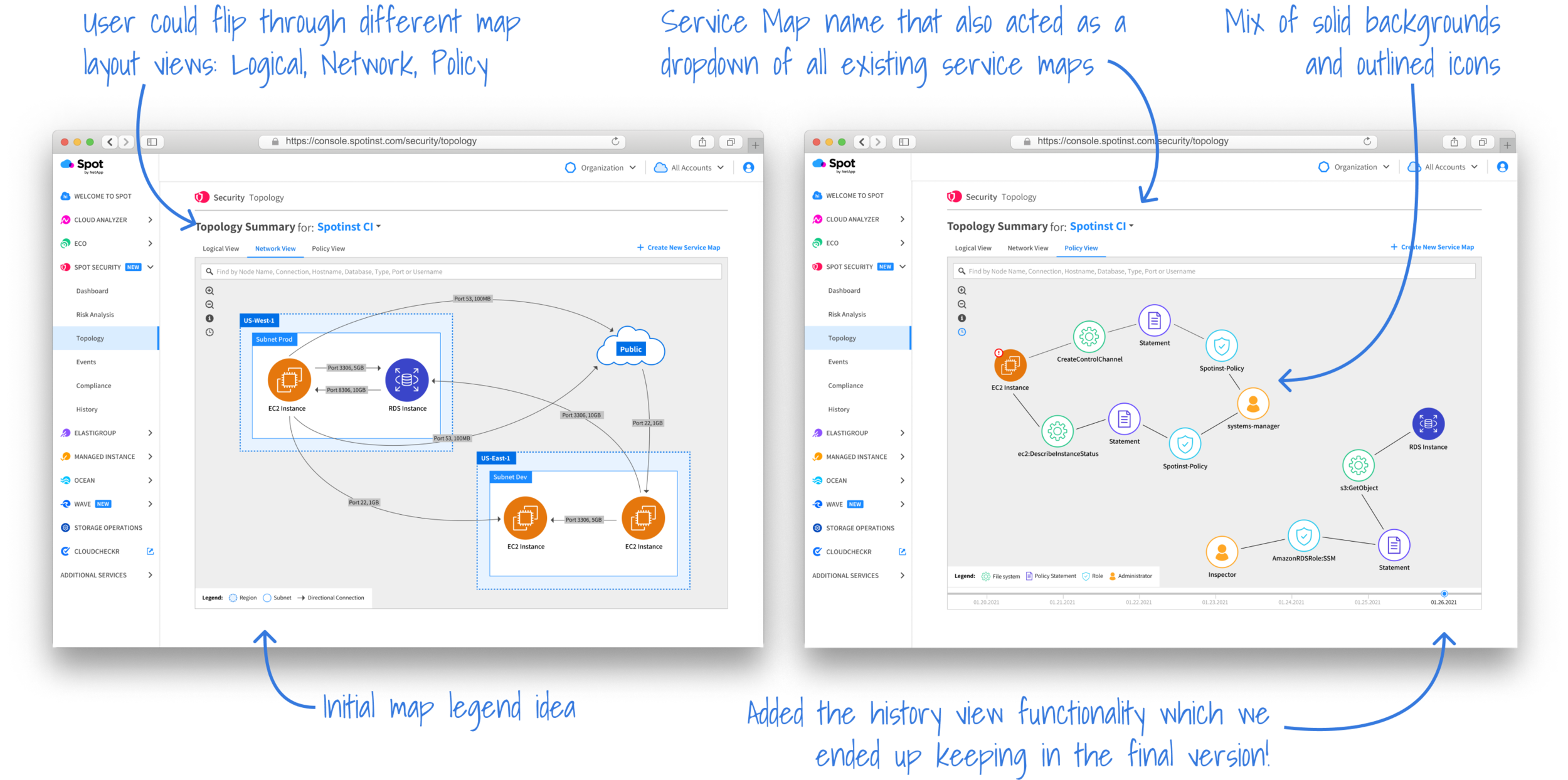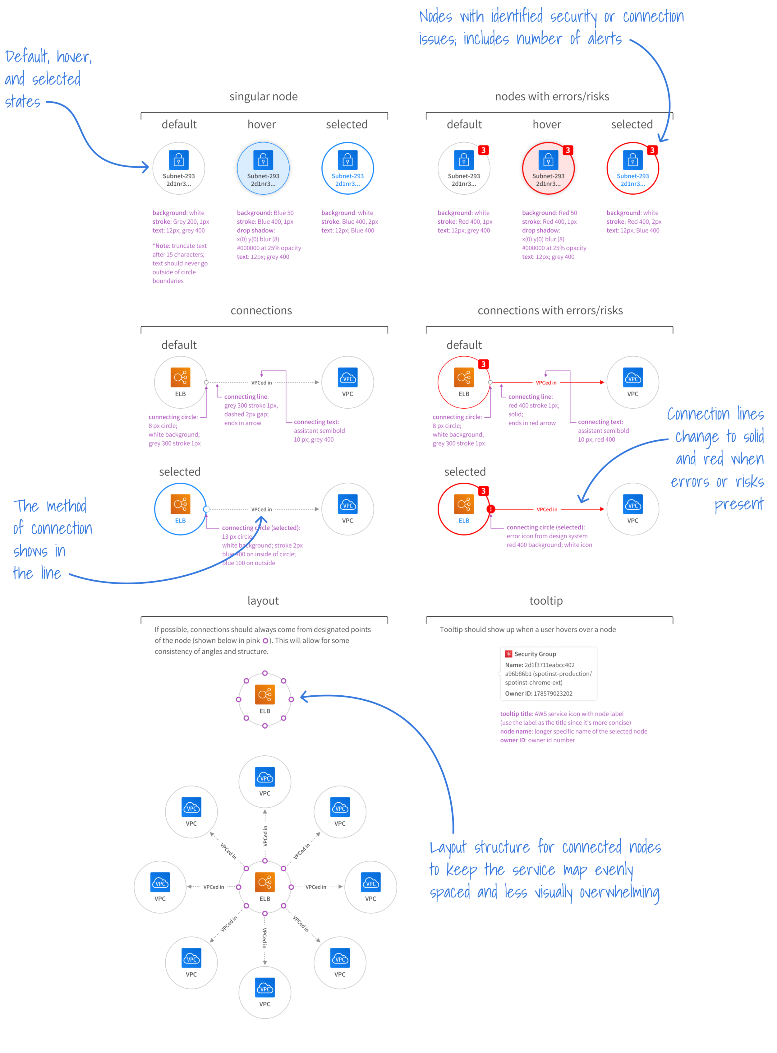 From speaking with existing customers and other DevOps and security engineers, we confirmed that these users were spending a lot of time in the AWS Console. Since our key users were already familiar with the structure and design of the console, we decided to continue incorporating the current service icons from AWS into our topology. We also looked at AWS Cloud Map and other diagram examples from the console for inspiration.