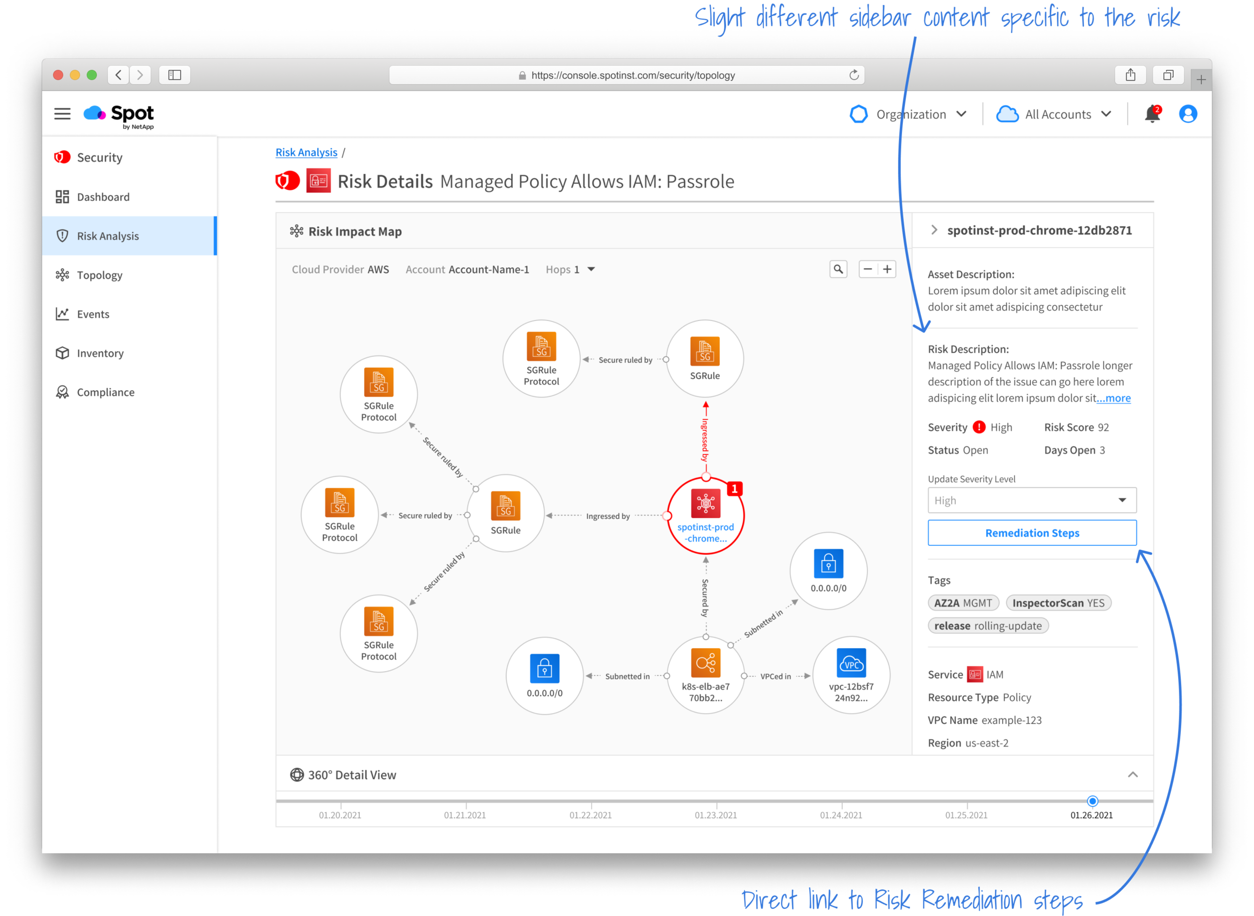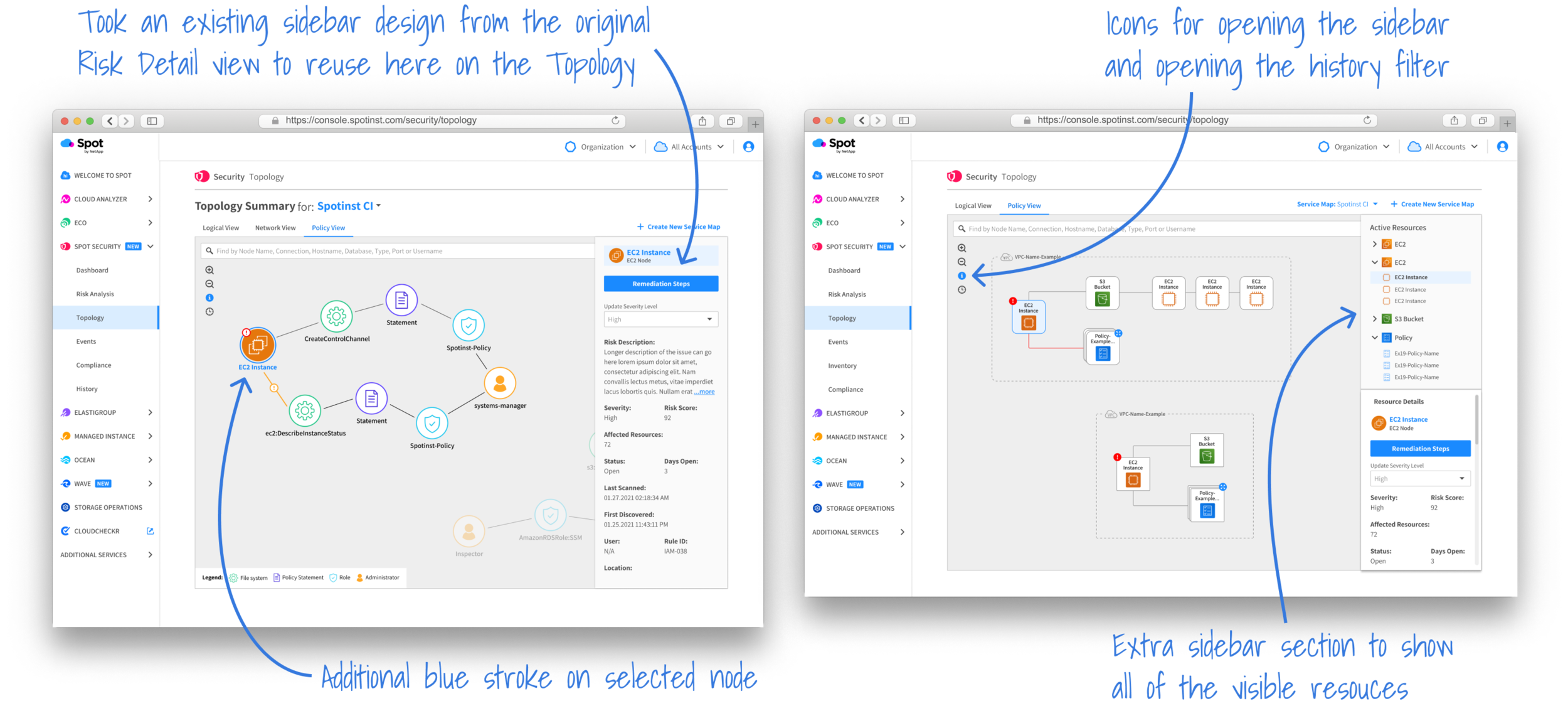Getting to the details of a security alert quickly is key for Spot Security. After considering the user flows for remediating risks, we decided that a version of our Topology map was the best way to allow users to investigate the details of a security risk. In the Topology map, we could show all the important alert metadata in the sidebar while simultaneously allowing the user to navigate through a visualization of all the resources connected to the specific risky node.