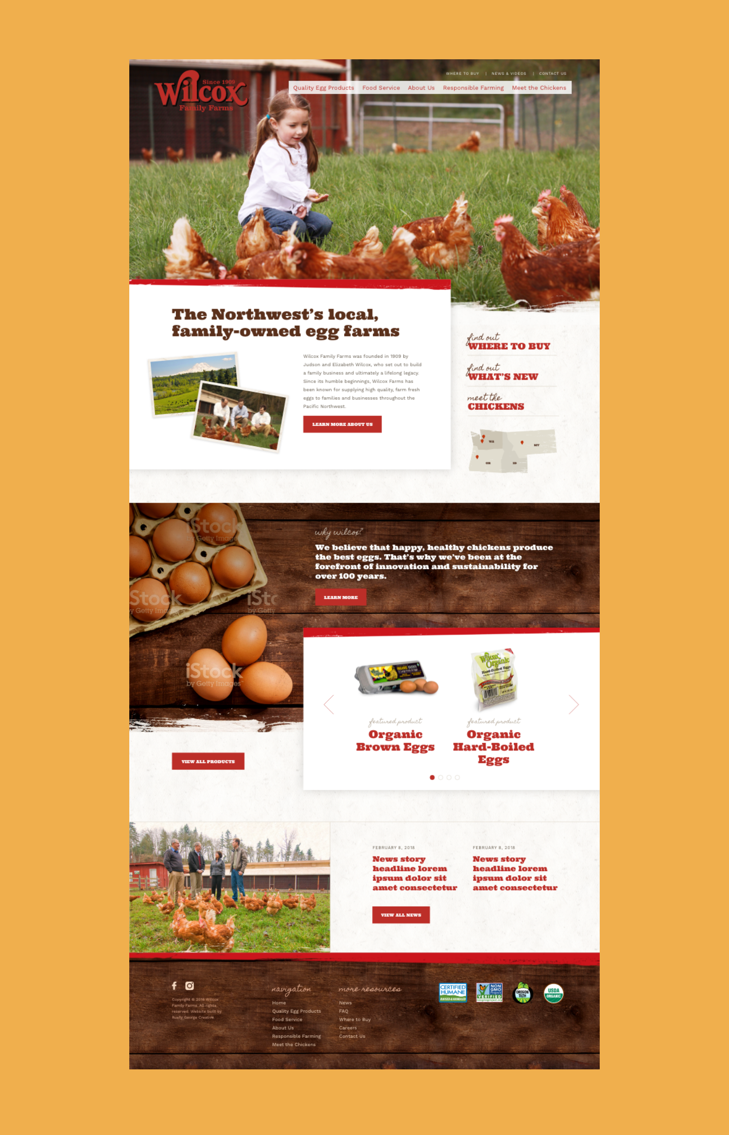 Wilcox Family Farms is a staple in the cage-free, free-range, organic egg world. Their retail egg products can be found in stores from Colorado to Alaska and all throughout the Pacific Northwest, where the Wilcox Family has called home for four generations. After an extensive rebranding effort to bring the company’s brand up to date to compete with other organic eggs and products, Wilcox needed a website to match. In addition to providing detailed information about their quality egg products, they also wanted to be able to showcase their sustainable farming efforts and community engagement in an attractive and interactive way.