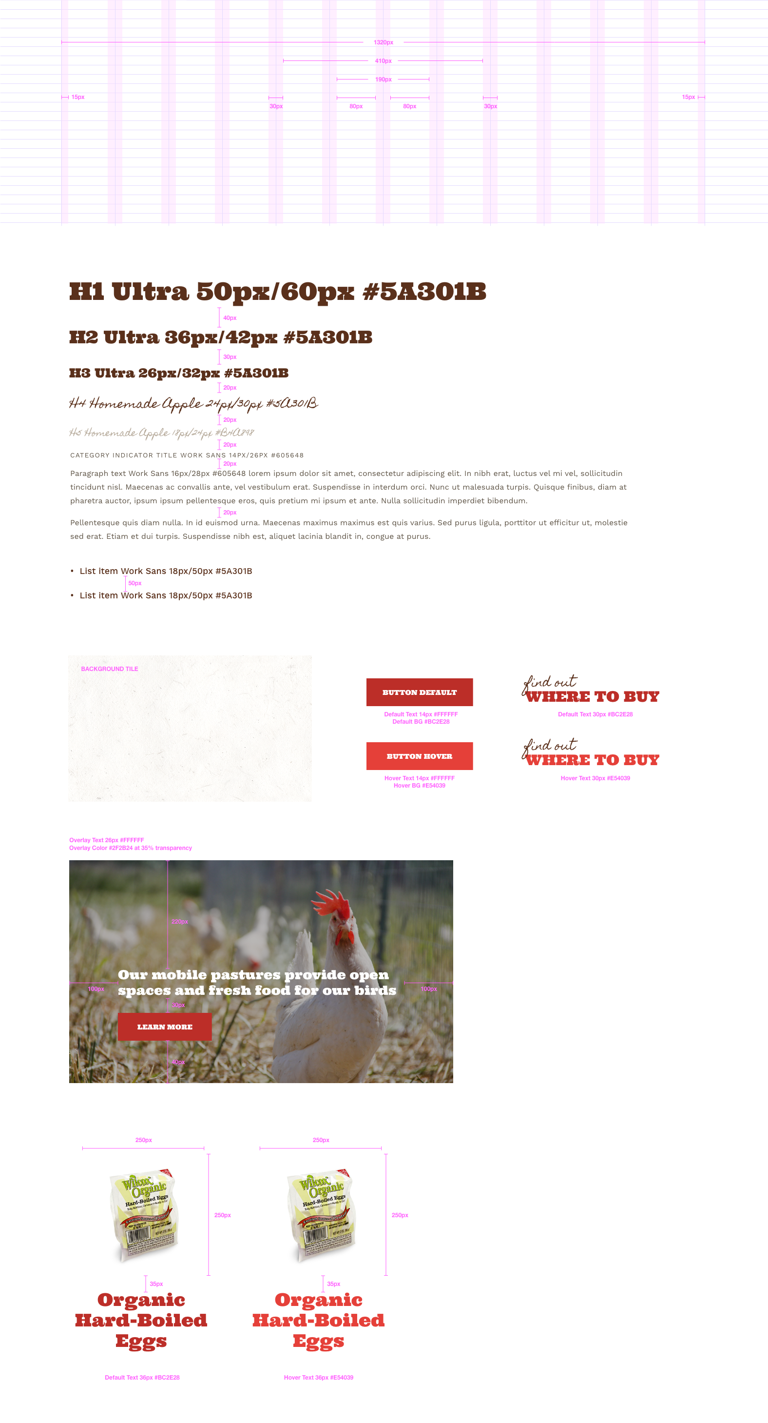 We highlighted three areas of content that were identified with the client including the latest news stories, where to buy the products, and a fun and interactive “Meet the Chickens” section. An additional thing that was important to the client was to tell the story of their four generations, so I created an animated company history timeline that reacts to mouse and hover interactions. We implemented a video background header on the home page, so the first thing the user sees is crafted footage of the chickens, the family, and the farm.